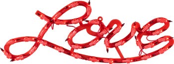 Set the mood this Valentine's Day with our captivating window silhouette. Crafted in elegant script print, the word "LOVE" glows warmly in vibrant red lights. Perfect for adding a touch of romance to any space, this enchanting silhouette is sure to ignite the sparks of love this Valentine's Day. Product Features: Color: red bulbs / red wire Number of bulbs: 35 Bulb size: mini 24" lead cord One-sided design Additional Product Features: Suction cup included If one bulb burns out, the rest will stay lit UL certified and approved for indoor or outdoor use Comes with replacement bulbs and spare fuses Contains 1 plug with end connector which allows you to stack multiple lighted items (not to exceed 210 watts) Wire gauge: 22 120 volts, 60 hertz, 0.12 amps, 14.4 watts Dimensions: 7" high x 17" wide Material(s): plastic/wire