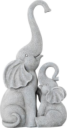 The resin Mother and Baby Elephant Statue is a heartwarming addition to any space. Crafted from resin, it features a mother elephant with a tall, gracefully curved trunk reaching upward, as if calling out or exploring. Beside her, a baby elephant sits close, its smaller trunk also curled in a cute manner, and one tiny leg playfully raised, creating an endearing scene of familial bond. The statue has a textured, speckled finish that gives it a realistic, almost stone-like appearance, adding to its charm and making it look like a timeless piece. Whether placed in a living room, on a shelf, or as part of a collection, it brings a sense of warmth and connection.