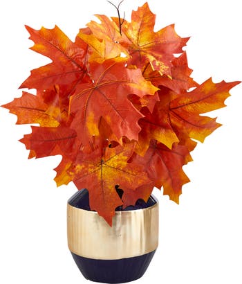 Nothing reflects autumn more than a classic maple leaf artificial plant. Inspired by the Canadian boreal forest, we designed your plant with naturally occurring details and vibrant shades of perfectly, imperfect leaves mimicking the fall foliage. Standing at 18” from a blue and gold planter, showcase mother nature's beauty during the Thanksgiving dinner table, Halloween, or cozy nights. Perfect for a family fun DIY fall design session minus the fear of the kids picking at the plant.