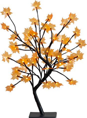 The Artificial Maple Tree brings a fireworks of leaves to your space, literally. Inspired by the most spectacular colors of the season, the orange, maple-shaped leaves have 48 warm white LED lights in the middle for a warm glow. Crafted from high-quality materials, the curved trunk has a distinct look that is unique. Standing 18-In from a sturdy base, display in any space in need of a autumn touch. Great for any desktop during the holidays.