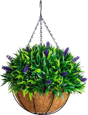 Revitalize your spaces with our UV-resistant artificial lavender hanging basket, bringing the beauty of blooming lavender to your home all year long. Crafted from high-quality materials, this basket captures the essence of a serene spring garden, with delicate lavender flowers that will stay vibrant forever. Simply hang and enjoy it in your desired space—it's UV-safe and perfect for outdoor use. Whether you're adding a touch of color to your front porch or creating a relaxing oasis, this hanging basket, at 18-In tall and suspended from a coconut-lined basket, is the ideal way to recreate your dream garden