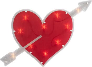 Add a touch of romance to your Valentine's Day décor with our charming window silhouette. Featuring a radiant red heart pierced by a cupid's arrow, illuminated with pre-lit clear lights, this enchanting display sets the perfect mood for a heartfelt celebration of love. Brighten up your home and share the warmth of the season with this captivating Valentine's Day accent. Product Features: Color: clear lights / white wire Number of bulbs: 10 Bulb size: mini 25" white lead cord One-sided design Additional Product Features: If one bulb burns out the rest will stay lit UL certified and approved for indoor or outdoor use Contains 1 plug with end connector allowing you to stack multiple lighted items together (not to exceed 210 watts) Comes with replacement bulbs and spare fuse Suction cup included 120 volts, 60 hertz, 0.08 amps, 9.6 watts Dimensions: 11" high x 18" wide Material(s): plastic/glass bulbs/wire