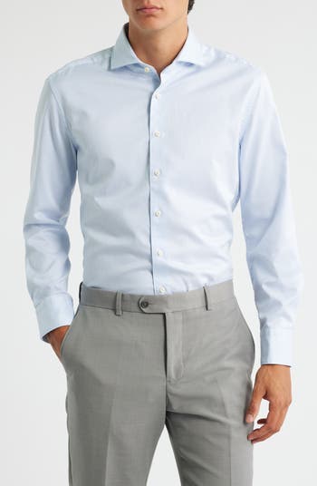 Two-ply cotton twill serves effortless four-season comfort in this non-iron dress shirt featuring a cutaway collar and shortened hem.