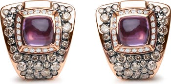 Gift you inner diva with the luxury she craves with these glamorous 18k rose gold stud earrings. These geometrical statement earrings show off the utter brilliance of 112 diamonds totaling 1 1/2 cttw with an approximate Brown and G-H Color with SI1-SI2 Clarity. An array of round white and heat-treated brown diamonds sit cradled in pave settings, complemented by round white diamonds in channel settings. The centerpiece in each earring is a natural 7mm cushion cut heat-treated purple amethyst gemstone in a secure bezel setting. Omega findings assure security for these pierces earrings for comfortable, worry-free wear all day long.