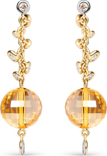 18K Gold 2/3 Cttw Diamond & Ball Shaped Citrine Gemstone Dangle Stud Earring