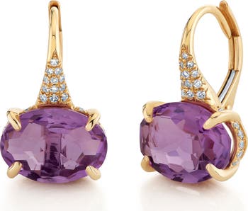 Round-cut diamonds enhance the luminosity of the oval-cut ameythst on these 18-karat-gold earrings.