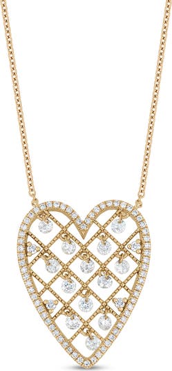 A heart-shaped lattice pendant traced in 66 round-cut diamonds is inset with an additional 13 dangling and 4 prong-set diamonds on this 18-karat gold necklace that will send light dancing with every twist.