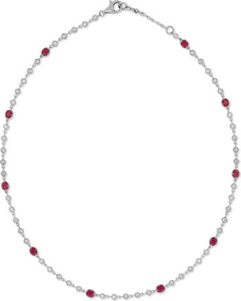 A total of 10 oval-cut rubies and 54 round-cut diamonds brings vibrant color and sparkle to this gorgeously handcrafted station necklace balanced by 18-karat white gold.