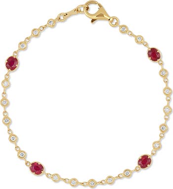 Prong-set rubies and diamond bezels bring stunning contrast to this handcrafted tennis bracelet set in 18-karat gold.