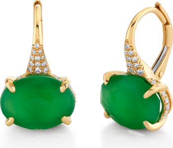 Round-cut diamonds enhance the luminosity of oval-cut green agate on these 18-karat-gold drop earrings.