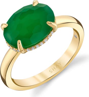 Round-cut diamonds encircle the setting, enhancing the luminosity of the statement oval-cut green agate atop this 18-karat-gold cocktail ring.