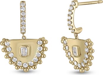 Half hoops suspend fan-shaped drops on these 18-karat-gold earrings shimmering with 36 round-cut diamonds and each centered by a bezel-set marquis-cut stone.