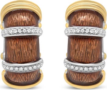 Add color to your jewelry collection with these huggie hoop earrings made from 18k yellow and white gold flash plated .925 sterling silver with clear brown enamel. These evocative earrings are rich in color as they are intricate metalwork. Rows of prong-set round diamonds add brilliant sparkle to the pair's aesthetic, creating a look that is unique to you. These diamonds total 9/10 cttw with an approximate F-G Color and VS1-VS2 Clarity. Latch findings keep these pierced earrings safe and secure on the ears for comfortable, worry-free all day wear.
