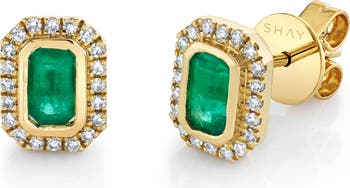 The gift of a lifetime, these luxe earrings of 18-karat gold showcase an emerald-cut emerald in a cutout, Art Deco-like setting, with a halo of diamond pavé.