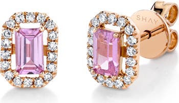 The gift of a lifetime, these luxe earrings of 18-karat gold showcase an emerald-cut pink sapphire in a cutout, Art Deco-like setting, with a halo of diamond pavé.