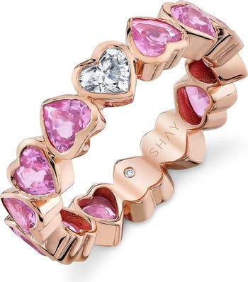 Bezel-set heart pink sapphires and diamonds make this American-crafted 18-karat-gold ring a colorful delight for any occasion.