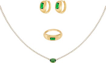 Bearfruit Jewelry 18k Gold Plated Sterling Silver Emerald Rectangle Necklace, Ring & Huggies Set Holiday Gift Idea, Main, color, Gold