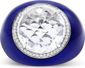 Imbued with a sense of vintage style, this 18k white gold ring features a white quartz centerpiece trimmed with a halo of brilliant diamonds for just the right amount of sparkle. The stunning 14mm white quartz is elegantly set with a thin bezel of white gold and accented with a halo of 48 white diamonds. This magnificent ring is finished with a vibrant patina of blue enamel. Turn heads with this showstopper of a cocktail ring.