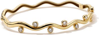 A contemporary interpretation of flowing water, this sculptural bangle features a series of bezel-set diamonds elegantly nestled along a soft undulating wave of 18-karat gold. Each gem punctuates the silhouette with brilliance, while the fluid form creates a sense of effortless movement. Refined yet distinctive, it’s designed to be worn solo for subtle impact or stacked for a more expressive, layered look.