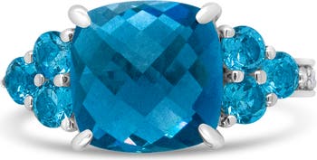 Blue is the new color of love. Wear love on your finger with this stunning blue topaz ring. A 10mm cushion shaped blue topaz gemstone sits as the central motif of this piece, flanked by 3 3.2 mm blue topaz gemstones on either side. The gemstones reflect beautifully against the 18k white gold band, which is further embellished with 10 natural round-cut white diamonds. The total carat weight of this piece is 1/6 c.t. Choose love, choose this blue topaz and diamond ring!