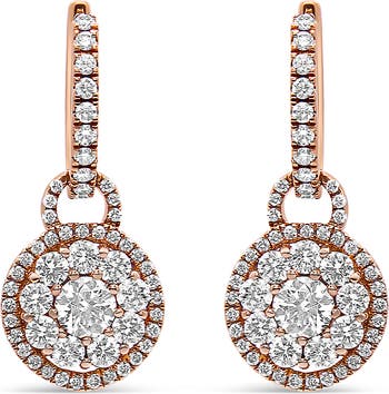 Timeless and elegant, these diamond drop earrings are the perfect complement to that special evening look. Created from vibrant 18K rose gold, each earring features a flower-shaped composite of shimmering round diamonds at its center. Each earring has one 1/5 ct td round diamond, which is surrounded by 9 smaller round diamonds. A halo frame of smaller accent diamonds surrounds the center composite and, on the horseshoe, shaped bail. Radiant with 1 1/2 ct. t.w. of diamonds and a polished shine, these post earrings secure comfortably with diamond studded lever backs.
