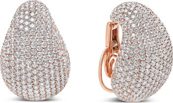 Drenched in the brilliant sparkle of over 675 total diamonds, these sculptural stud earrings display their dazzling wealth in pave settings in an all-over design of ultimate glamour. Crafted of genuine 18k rose gold, these domed earrings exude luxury and romantic beauty. Round diamonds twinkle from every angle, making you the toast of any room you enter. These magnificent diamonds total 13 1/5 cttw with an approximate G-H Color and SI1-SI2 Clarity. Omega findings secure these pierced earrings in your ears for comfortable, worry-free wear.