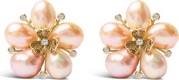 Immerse yourself in the ethereal elegance of these 18K rose gold earrings, where sophistication meets mother nature's artistry. Each stud is meticulously crafted, featuring a graceful floral motif that blossoms with five baroque-shaped cultured pearls from China, their iridescent sheens of white, yellow, and pink mirroring the enchanting hues of a radiant dawn. Cradled within these botanical wonders are natural diamonds, their sparkle ranging from the warm tones of Champagne to the clear brilliance of H-I color, all in VS2-SI1 clarity, adding a whisper of opulence. Secured with Omega back findings, these earrings promise a comfortable fit for continued admiration. Perfect for those who cherish a blend of classic grace and organic beauty, these treasures are a testament to the delicate balance between precision and spontaneity in luxurious adornment.