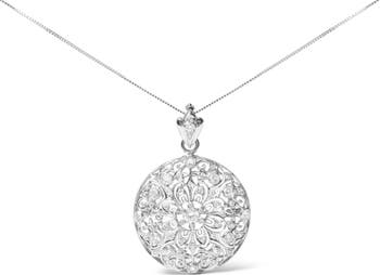 This captivating vintage-inspired pendant necklace is crafted in cool 18k white gold in an elegant openwork filigree motif set with stunning round diamonds. The floral filigree pattern features these sparkling diamonds within secure bezel settings. These diamonds total 1 5/6 cttw with an approximate G-H Color and I1-I2 Clarity. The pendant suspends from an 18" box chain with spring ring clasp, yet its versatile design also makes it a brooch pin for dual styling options.