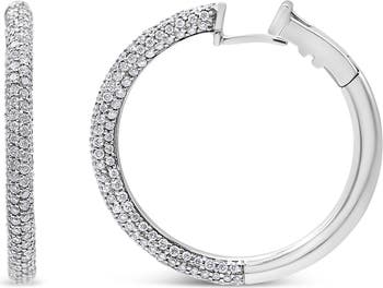 A dewy oval silhouette drips with French pavé-set diamonds giving these 18k white gold hoop earrings a dazzling modern look that commands attention with their subtle light. These stunning semi-eternity hoop earrings feature 400 natural diamonds meticulously pave set across the front, giving 360 degree sparkle. These 2 1/3 carat diamond hoop earrings are a one-of-a-kind treasure. The earrings dangle approximately 1" inch from your earlobe. Comes with an lever back for a secure and comfortable fit.