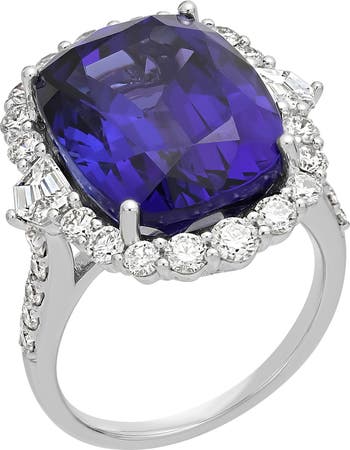Framed by two tapered diamonds and 74 round diamonds that extend down the slender band, a cushion-cut tanzanite stone dazzles at the center of this handcrafted ring, meticulously designed to capture and reflect light.