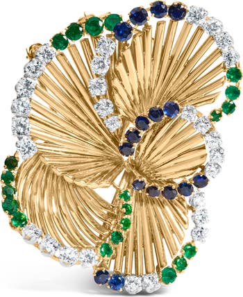 18K Yellow Gold 2 1/3 Cttw Diamond, Sapphire, and Emerald Sculpted Petal Brooch Pin