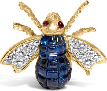 Elevate your ensemble with the enchanting charm of this bumblebee brooch, impeccably crafted from 18K yellow gold. This elegant pin is a treasure trove of natural beauty, featuring wings dusted with 3/8 cttw of sparkling, high-clarity (VS2-SI1) natural diamonds with an F-G color grade, set in a rhodium-plated pave that brilliantly enhances their luminous whiteness. The bee's body is sumptuously adorned with 5 4/5 cttw of rich, blue sapphires. These gems, along with the penetrating ruby eyes set in precise bezels, have been color treated to achieve their vivid allure, capturing the quintessence of nature's splendor. This brooch, a symbol of diligent grace and vibrant life, promises to add a touch of luxe and a splash of color to any attire.