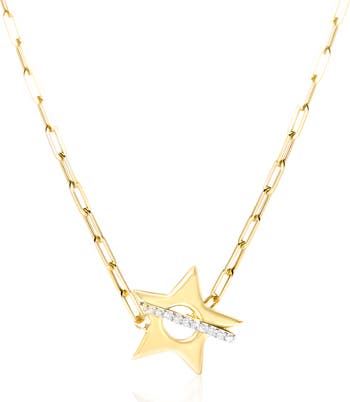18K Yellow Gold Plated Sterling Silver Diamond Accent Star Pendant Necklace with Paperclip Chain