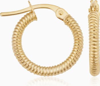 Our Ribbed Mini Hoops are a modern, textured take on the timeless hoop shape. Each rib is crafted by hand in Italy with 18k solid gold to create bold ridges that contrast beautifully with the polished shine.