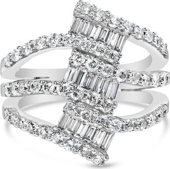 Effortlessly fusing architectural elegance and lustrous allure, this rhodium-plated 18K white gold cocktail ring is a symphony in design. Captivating with its multi-crossover and split shank silhouette, the band gracefully cradles a grand total of 1 3/4 carats of natural diamonds. These gems, round and baguette cut, twinkle with an H-I color and SI2-I1 clarity; round diamonds dance in prong settings, while baguettes glide into sleek channel settings, imbuing the piece with a dimensional shimmer. Crafted exclusively in size 7, this ring is not just jewelryâit's a statement of intricate craftsmanship and opulent style, designed to captivate and charm, enhancing any ensemble with a splash of radiant sophistication.