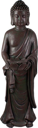 You can add to the zen in your garden or outdoor living space with this beautiful Buddha statue. Intricately designed and colored as a weathered statue, he is holding a lotus flower, meaning purity of the body, speech, and mind to achieve enlightenment. Perfect to place in your garden or in your lawn, or virtually anywhere with a flat surface. Features: Polyresin standing Buddha outdoor garden statue Holds a lotus flower meaning purity of the body, speech, and mind Long ears to symbolize spiritual enlightenment Intricate features from his hair to his toes This Buddha is barefoot Has a round flat base for stability Made to resemble a weathered statue Crafted from quality polyresin for years of enjoyment Dimensions: 19.5"H x 7"W x 7.5"D Material(s): polystone/resin mix