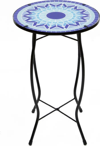 This garden table will be your best patio decoration. The blue sun mosaic design will add a pop of color to your greenery. Place down your drink, a light snack or your cell phone for easy grabbing. It can even be a great stand for a small plant. Product Features: Metal and glass garden table Black metal legs for stability Blue sun design in geometric rectangular shapes Perfect for patios, porches and small hallways Minor assembly required Dimensions: 19“ high x 12" diameter Material(s): glass/metal