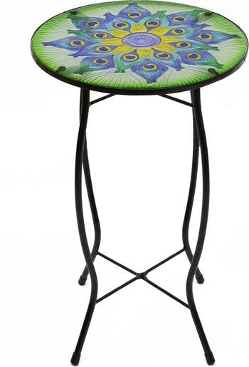 This garden table will be your best patio decoration. The floral peacock design with blue and green feathers will add a pop of color to your greenery. Place down a light snack or your cell phone for easy grabbing. It can even be a great stand for a small plant. Product Features: Metal and glass garden table Features the peacocks blue and green tail of feathers Feathers have a floral design Black metal legs for stability Perfect for patios, porches and small hallways Dimensions: 19“ high x 12" diameter Material(s): glass/metal