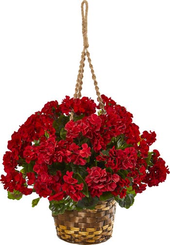 Colors are bold and are meant to draw the eye. Equipped with several blooms, it'll be hard to miss this statement piece. Green foliage complements the vibrant blooms and adds volume to the artificial geranium hanging basket.