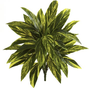 You won't find any pocket of space between each leaf with this 19-inch tradescantia artificial plant. The broad, light and dark green variegated leaves are tightly clustered together, fanning out in a circular motions around a single stem. Pair this piece with a neutral toned pot that won't take away from the gorgeous leaves, and perch it at the end of your kitchen bar for a stunning finish. Arrives with six individual plants.