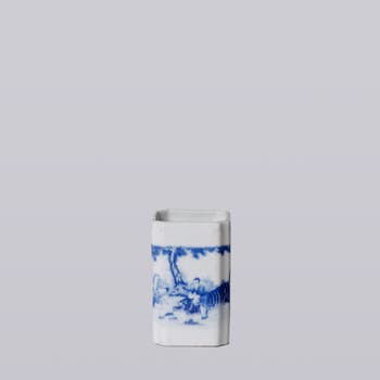 Cobalt Guild offers an assortment of blue and white porcelain vessels from the antiques markets of Jingdezhen, a town long distinguished by imperial patronage. This piece is a tiny vase/cachepot with a tiger motif, 3 1/8" W x 5" H (3 3/4" diagonal measurement). The style and form are reminiscent of 1920s wares of the early Chinese republic. Cue the design nostalgia!