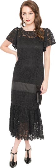 This stunning 1920s flapper dress is set in a sheer fabric over a matching slip. With a scoop neck, flutter sleeves, and drop waist ribbon and bow. Secured with a convenient back zipper, getting dressed up has never been easier or more stylish.