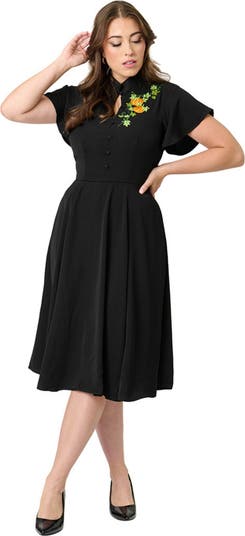 The Baltimore Swing Dress is cast in a lightweight fabric. The lovely faux button up front is framed by a charming high collar and floating cap sleeves. The darted bodice tops the seamed waist while a paneled A-line swing skirt swishes delightfully around your knees in a straight hem.