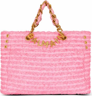 1945 Soft tote in tweed-effect raffia Carry in the hand or wear on the shoulder Semi-removable metal Balmain logo Adjustable side gussets, 3 press studs Double handles in leather and chains interlaced with leather Engraved eyelets Magnetic fastening Twill lining Metal bag feet Inside zipped pocket Embossed leather card pocket Gold hardware Dimensions: 40 x 30 x 13.5��cm Main material: 86% polyamide 14% cotton Made in Italy Item: EN0FF975TRWE