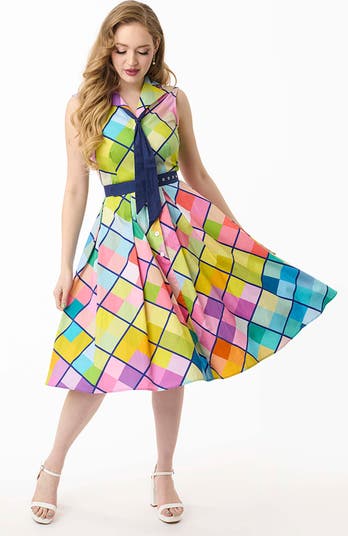 This swing dress is crafted in a lightweight woven fabric. Outfitted with a button up bodice, a removable black neck tie, a belt, and side pockets!