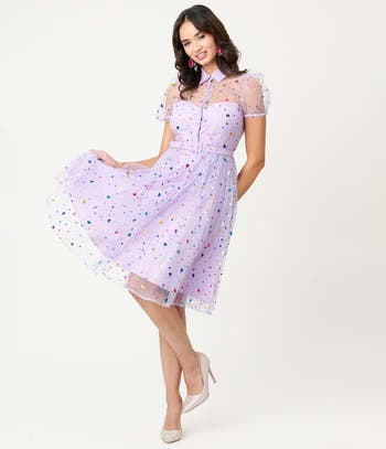 This dress is crafted in tulle and features a button up front and a darling illusion neckline, topped by a collar and framed by short sleeves with elastic cuffs. The seamed waist is cinched with a belt while the gathered swing skirt cascades over lining for comfortable all day wear!