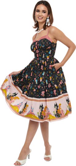 This swing dress is crafted in a lightweight woven material. Outfitted with adjustable spaghetti straps, faux buttons, a back zipper, and side smocked panels.
