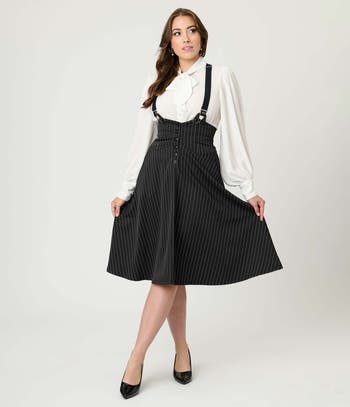This stunning 1950s piece features adjustable and removable suspenders for a customizable look. With a button-up front and side pockets, this skirt combines style with functionality, perfect for any occasion.