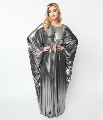 This fabulous 1970's style caftan from Smak Parlour is crafted in a dazzling stretch knit fabric and is framed by long sweeping sleeves. The back features a button collar closure while the waist is nipped in with self ties for a marvelous fit.