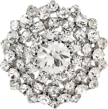 Classic elegance. Silver plated brooch embellished with round cut clear Swarovski crystals. Safety pin closure.